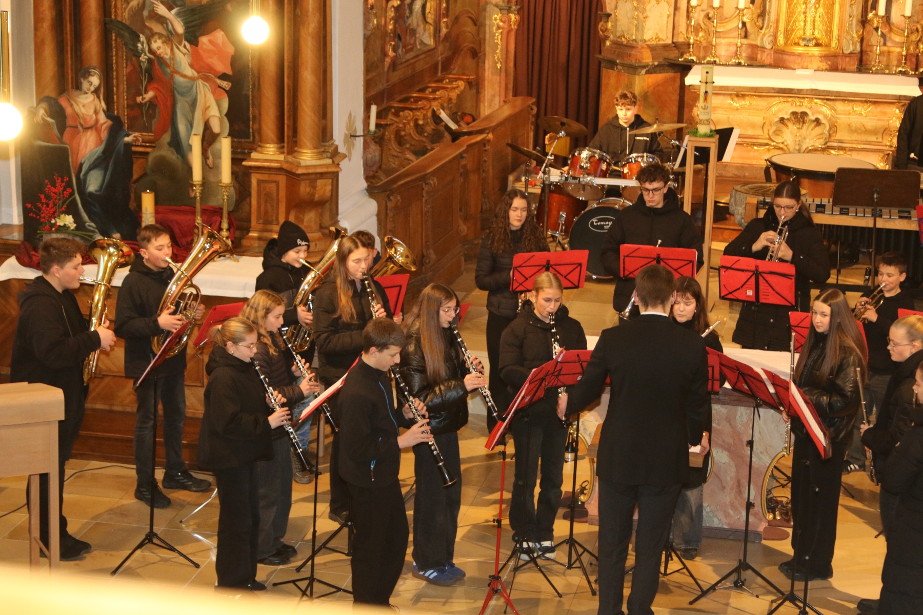 Das Programm war geprägt von einer abwechslungsreichen Mischung aus traditionellen Weisen und feierlichen instrumentalen Stücken. Das Jugendorchester sowie das Blechbläserensemble sorgten mit ihren kraftvollen Klängen für einen festlichen Rahmen, während das Klarinettenquartett mit feinen, harmonischen Melodien besondere Akzente setzte. Ein Gesangsensemble bereicherte den Abend zudem mit feinfühligen vokalen Interpretationen und verlieh dem Konzert eine sehr persönliche Note.